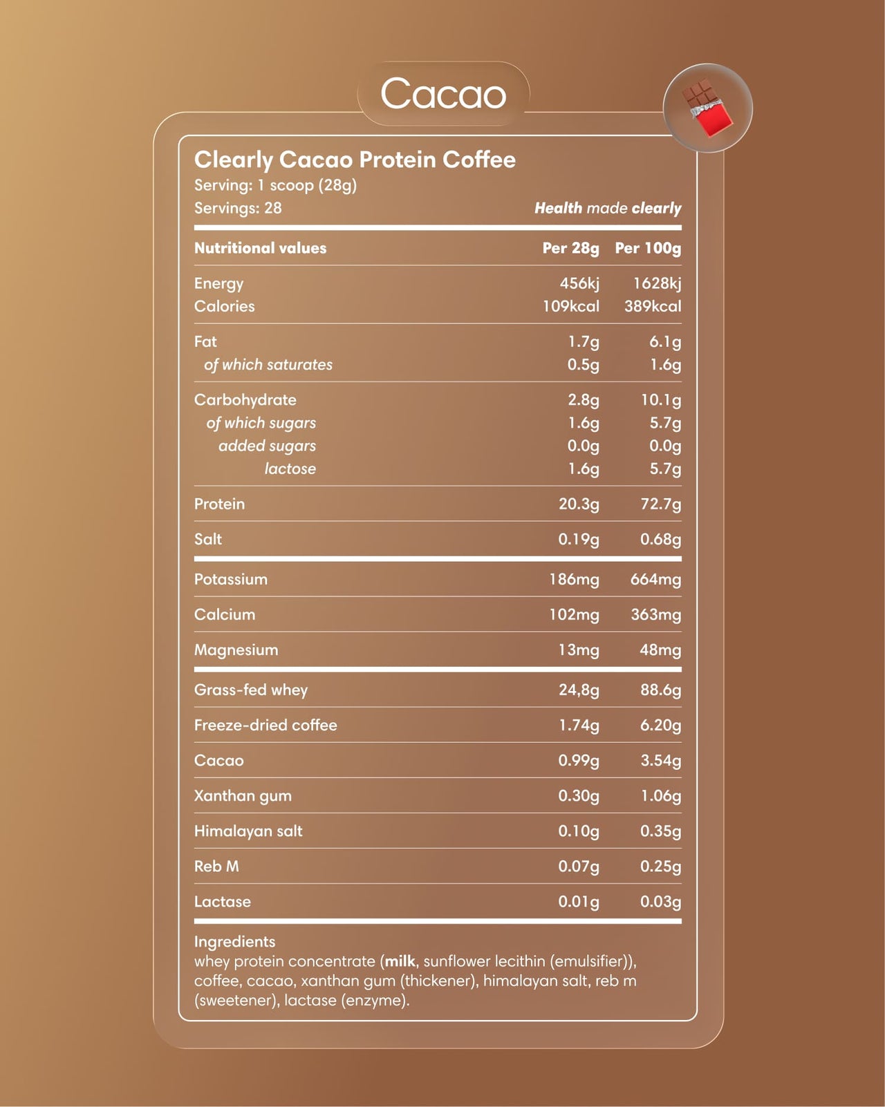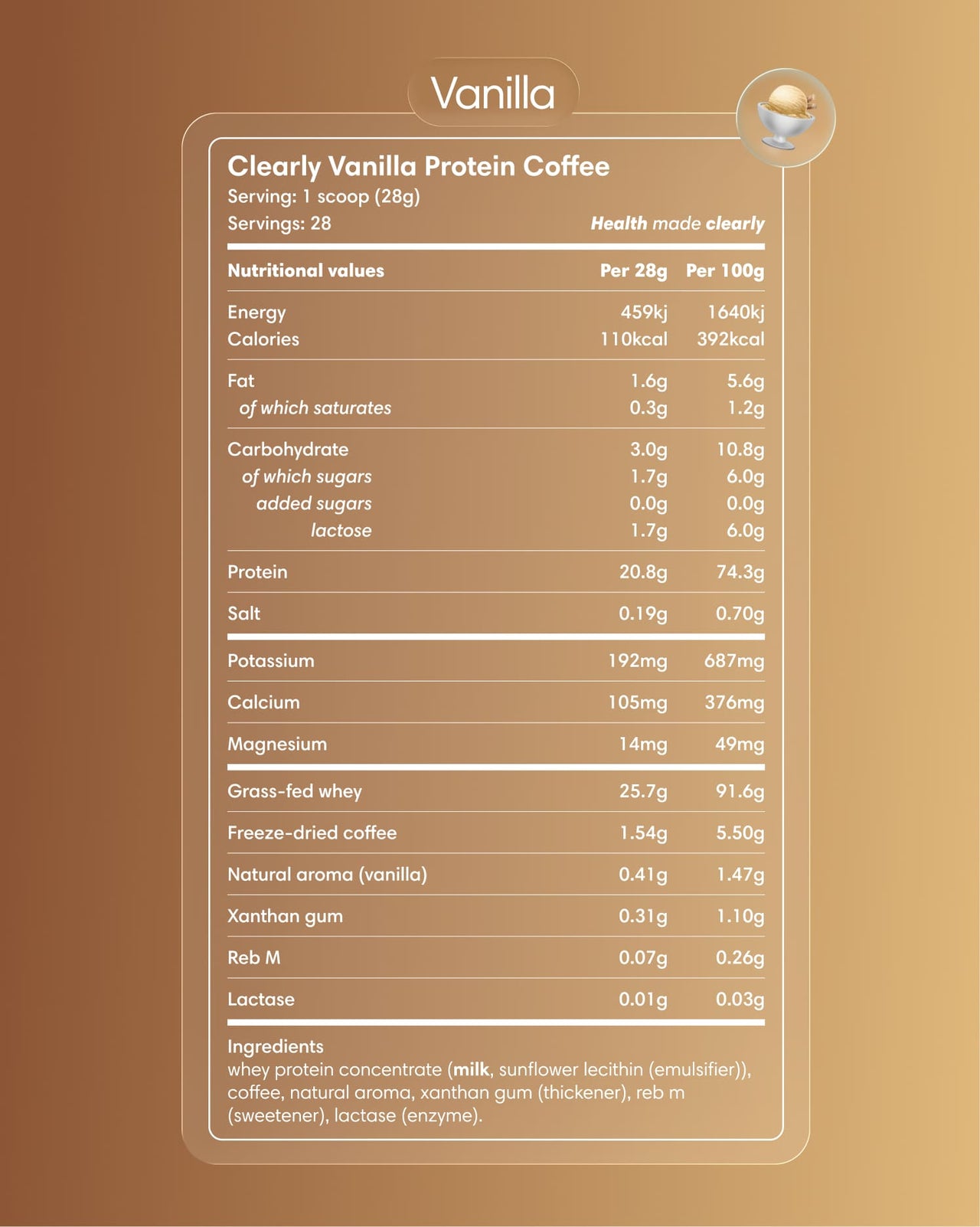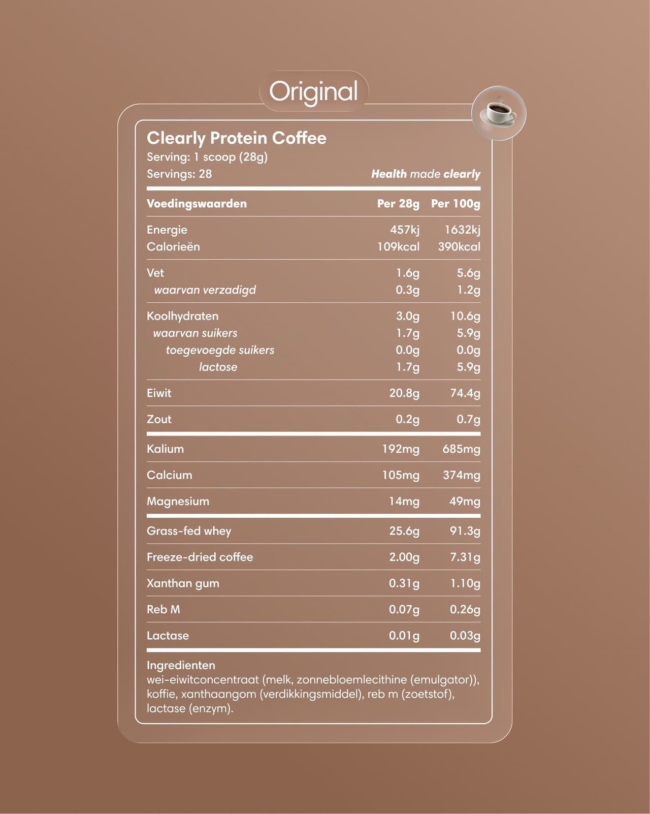 Onze Eiwit IJskoffie combineert 100% Colombiaanse arabica koffie met whey van grasgevoerde koeien uit Nieuw-Zeeland. De koffie is gevriesdroogd om de smaak optimaal te behouden, en de whey is afkomstig van koeien die minstens 350 dagen per jaar buiten grazen. Een schoon alternatief met 21 g eiwit en 35–45 mg cafeïne.