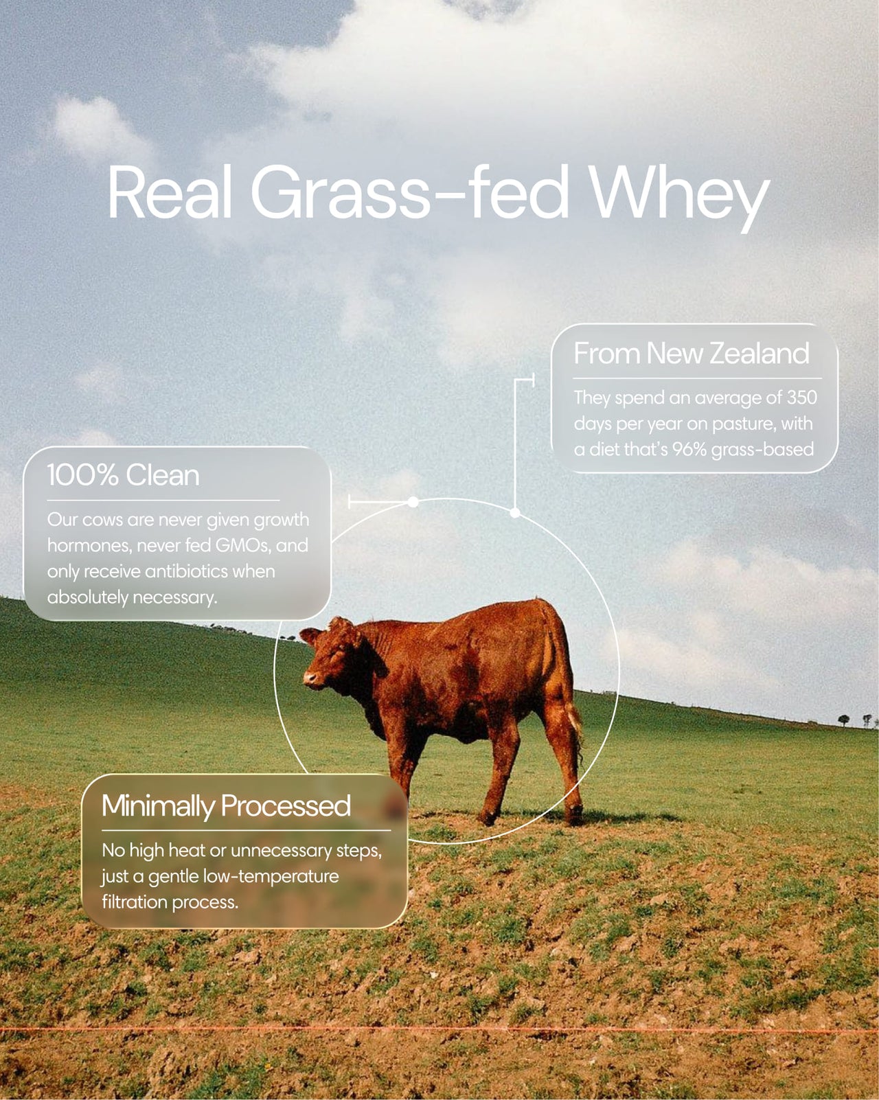 De meeste whey komt van koeien die het grootste deel van hun leven binnen staan en worden gevoerd met granen. Onze whey komt uit Nieuw-Zeeland, waar de koeien minstens 350 dagen per jaar buiten grazen, met een dieet van minimaal 96% gras. Deze manier van boeren zorgt niet alleen voor een zuiverder, eiwitrijker product, maar ook voor een veel beter dierenwelzijn.