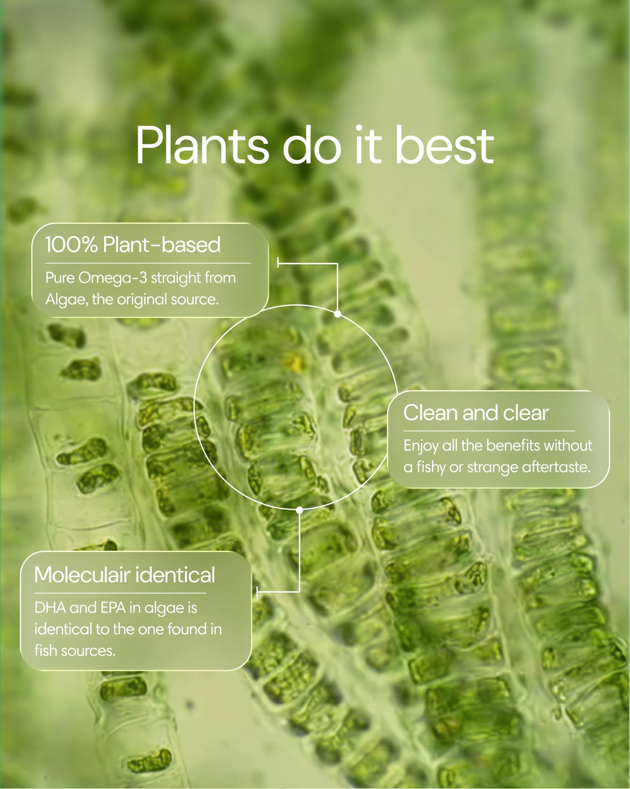 Algen zijn de oorspronkelijke bron van omega-3 vetzuren, zoals DHA en EPA. Door rechtstreeks naar de bron te gaan, vermijden we vis, waardoor het product 100% plantaardig en duurzamer is. Bovendien voorkom je zo de nadelen van visolie, zoals een vissmaak of zorgen over overbevissing.
